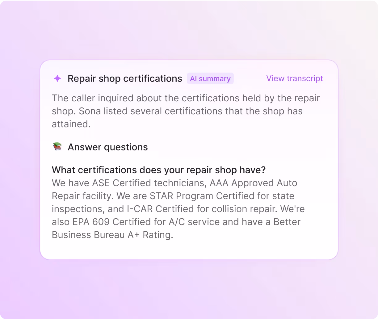 Sona works inside Quo's platform, giving your team access to its call summaries, transcripts, recordings, and messages right after every call ends. For example, your team can review a caller’s vehicle details and history and assign jobs based on repair schedules. By connecting your answering service with your phone system, your team never loses track of a single customer detail.