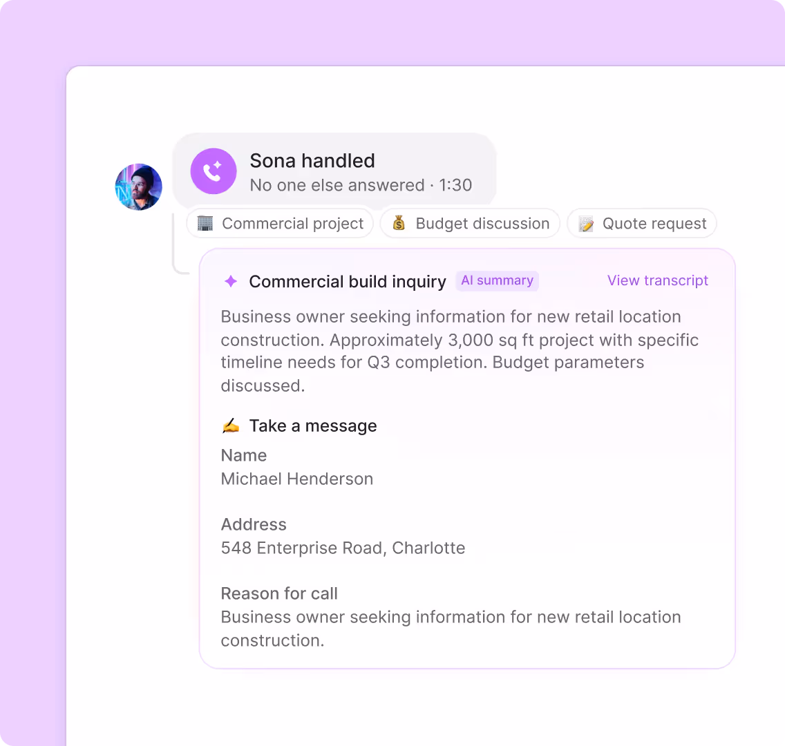 Any business can use Sona to handle incoming calls, answer customer questions, and take down messages. What makes Sona unique is that it can be customized to every business’s needs. Whether you’re a specialty contractor or a general contractor in the construction industry, you can use Sona as your in-house AI answering service.