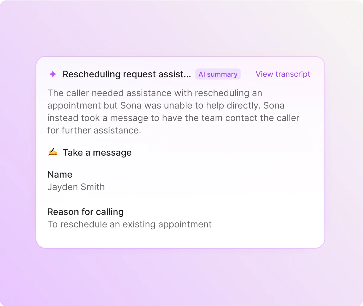 Sona greets callers, answers questions, and captures detailed messages all within your business phone system.
