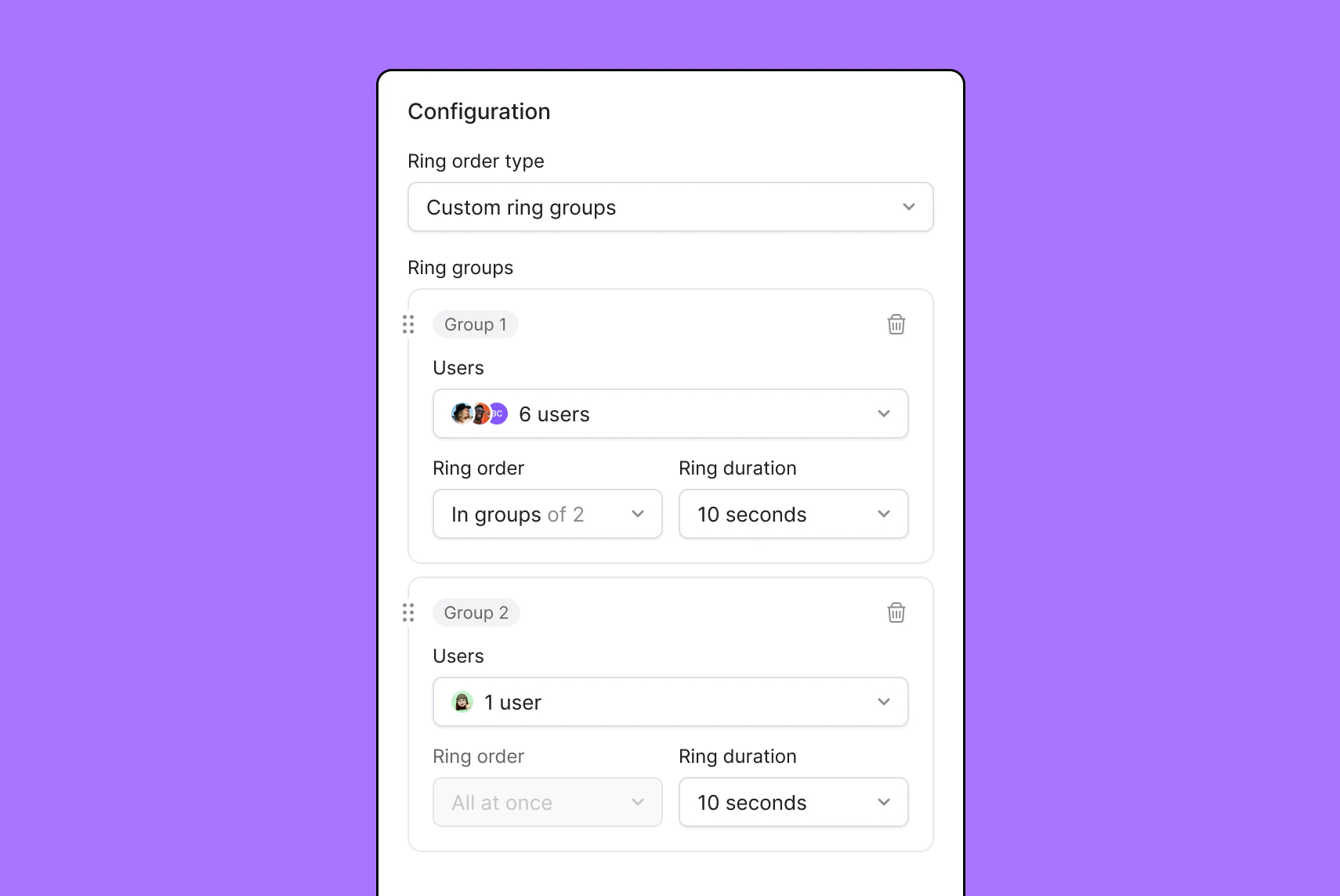 Decide who on your team receives incoming calls with custom ring groups or delegate calls and texts to team members.